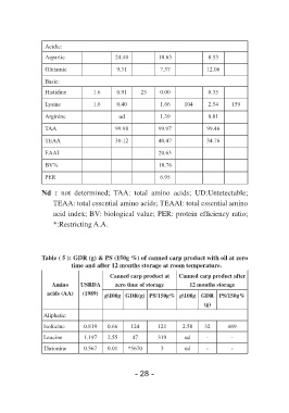 Table ( 5 ): GDR (g) & PS (150g %) of canned carp product with oil at zero